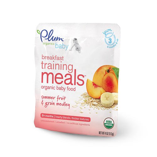 - Plum Organics Breakfast Training Meals (8+ months) contain protein-rich fruit & grain blends that are perfect for "training" baby's breakfast diet with nutritionally complete meals. Breakfast Training Meals offer the third step in developing baby's palate with homemade flavors and heartier, thicker textures. Our breakfast recipes include a blend of organic fruits and vegetables that are gently cooked and naturally preserved in a convenient pouch that's perfect for flexible portions.