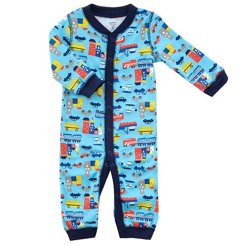 - Suit up your little dude for play in the adorable Carter's Transportation-Print Easy-Entry Sleep 'n Play. It's designed in super-comfy cotton with a bright, multi-color transportation print and exposed blue stitching. Snaps down the front and legs make dressing and diapering a breeze.